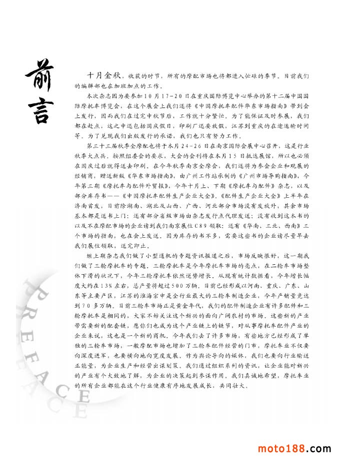 本次雜志因?yàn)橐獏⒓?0月17-20日在重慶國際博覽中心舉辦的第十二屆中國國際摩托車博覽會(huì),在這個(gè)展會(huì)上我們還將《中國摩托車配件華東市場(chǎng)指南》帶到會(huì)上發(fā)行,因而我們?cè)谶^完中秋節(jié)后,工作就十分繁忙。為了能保證及時(shí)參展,我們都在趕點(diǎn),這之中還包括國慶假日,印刷廠還要放假,江蘇到重慶的在途運(yùn)輸時(shí)間等。為了兌現(xiàn)我們出版發(fā)行的承諾,我們也只有努力工作。