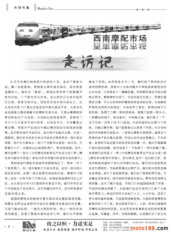 本次雜志因為要參加10月17-20日在重慶國際博覽中心舉辦的第十二屆中國國際摩托車博覽會,在這個展會上我們還將《中國摩托車配件華東市場指南》帶到會上發行,因而我們在過完中秋節后,工作就十分繁忙。為了能保證及時參展,我們都在趕點,這之中還包括國慶假日,印刷廠還要放假,江蘇到重慶的在途運輸時間等。為了兌現我們出版發行的承諾,我們也只有努力工作。