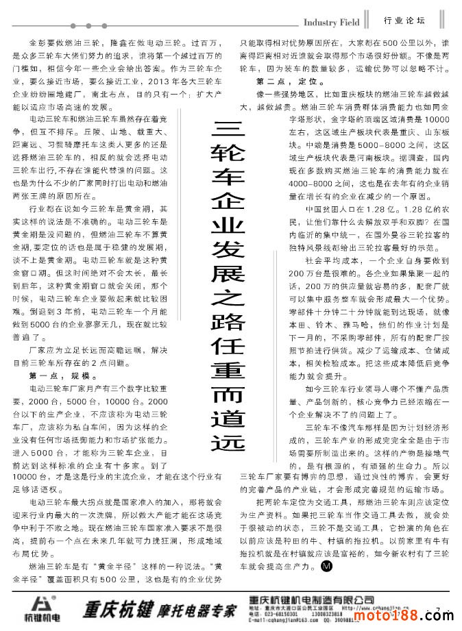 繼上期雜志我們做了小型通機的專題資訊報道之后,市場反映很好,這一期我們做了三輪摩托車的專題。三輪摩托車是今年摩托車市場的亮點,在二輪車市場整體下滑的狀況下,今年三輪摩托車依然逆勢增長。從現有統計數據看,今年增長幅度大約在13%左右,總產量將超過500萬輛。目前已經形成以河南、重慶、廣東、山東等主要產區,江蘇的淮海宗申是全行業最大的三輪車制造企業,今年產銷量竟達到70多萬輛。目前三輪車市場正是黃金年代,我們的配件制造企業有許多配件和三輪摩托車是相同的,大家不妨關注這個新興的面向廣闊農村的市場。這些新的產業帶需要新的配套鏈,愿你們也成為這個產業鏈上的鏈節,對從事摩托車配件產業的企業來說,這也是一個新的商機。今年我們去了許多市場,有些地方已經形成了單獨的三輪車市場,一般摩配市場也增加了三輪車配件經營的門市,摩托車業不僅要向深度進軍,也要橫向地向寬度發展。作為輿論導向的媒體,我們也要向行業輸送正能量,為企業生產和經營出謀劃策。我們通過組織系列的資訊,讓企業能對新興的產業有個大致地了解,為企業的決策起到參謀作用。我們真誠地希望,摩托車業的所有企業都能在這個行業健康有序地發展成長,共同壯大。