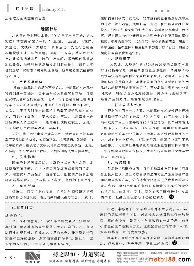繼上期雜志我們做了小型通機(jī)的專題資訊報(bào)道之后,市場反映很好,這一期我們做了三輪摩托車的專題。三輪摩托車是今年摩托車市場的亮點(diǎn),在二輪車市場整體下滑的狀況下,今年三輪摩托車依然逆勢增長。從現(xiàn)有統(tǒng)計(jì)數(shù)據(jù)看,今年增長幅度大約在13%左右,總產(chǎn)量將超過500萬輛。目前已經(jīng)形成以河南、重慶、廣東、山東等主要產(chǎn)區(qū),江蘇的淮海宗申是全行業(yè)最大的三輪車制造企業(yè),今年產(chǎn)銷量竟達(dá)到70多萬輛。目前三輪車市場正是黃金年代,我們的配件制造企業(yè)有許多配件和三輪摩托車是相同的,大家不妨關(guān)注這個新興的面向廣闊農(nóng)村的市場。這些新的產(chǎn)業(yè)帶需要新的配套鏈,愿你們也成為這個產(chǎn)業(yè)鏈上的鏈節(jié),對從事摩托車配件產(chǎn)業(yè)的企業(yè)來說,這也是一個新的商機(jī)。今年我們?nèi)チ嗽S多市場,有些地方已經(jīng)形成了單獨(dú)的三輪車市場,一般摩配市場也增加了三輪車配件經(jīng)營的門市,摩托車業(yè)不僅要向深度進(jìn)軍,也要橫向地向?qū)挾劝l(fā)展。作為輿論導(dǎo)向的媒體,我們也要向行業(yè)輸送正能量,為企業(yè)生產(chǎn)和經(jīng)營出謀劃策。我們通過組織系列的資訊,讓企業(yè)能對新興的產(chǎn)業(yè)有個大致地了解,為企業(yè)的決策起到參謀作用。我們真誠地希望,摩托車業(yè)的所有企業(yè)都能在這個行業(yè)健康有序地發(fā)展成長,共同壯大。