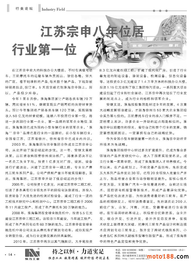 繼上期雜志我們做了小型通機的專題資訊報道之后,市場反映很好,這一期我們做了三輪摩托車的專題。三輪摩托車是今年摩托車市場的亮點,在二輪車市場整體下滑的狀況下,今年三輪摩托車依然逆勢增長。從現有統計數據看,今年增長幅度大約在13%左右,總產量將超過500萬輛。目前已經形成以河南、重慶、廣東、山東等主要產區,江蘇的淮海宗申是全行業最大的三輪車制造企業,今年產銷量竟達到70多萬輛。目前三輪車市場正是黃金年代,我們的配件制造企業有許多配件和三輪摩托車是相同的,大家不妨關注這個新興的面向廣闊農村的市場。這些新的產業帶需要新的配套鏈,愿你們也成為這個產業鏈上的鏈節,對從事摩托車配件產業的企業來說,這也是一個新的商機。今年我們去了許多市場,有些地方已經形成了單獨的三輪車市場,一般摩配市場也增加了三輪車配件經營的門市,摩托車業不僅要向深度進軍,也要橫向地向寬度發展。作為輿論導向的媒體,我們也要向行業輸送正能量,為企業生產和經營出謀劃策。我們通過組織系列的資訊,讓企業能對新興的產業有個大致地了解,為企業的決策起到參謀作用。我們真誠地希望,摩托車業的所有企業都能在這個行業健康有序地發展成長,共同壯大。