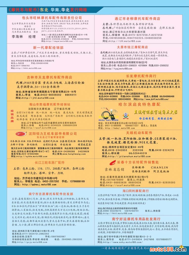 第三十三屆秋季全摩配也將于本月24-26日在南京國際會展中心召開,這是行業(yè)秋季大點兵。按照組委會的要求,大會的會刊將在本月15日抵達展館,所以也必須在國慶過后就得送去印刷。在今年秋季南京全摩會,我們還將為參會企業(yè)和觀展的經(jīng)銷商,贈送新版《華東市場指南》,由廣州工作站承制的《廣州市場導購指南》,今年第三期《摩托車與配件外貿(mào)報》,今年十月上、下期《摩托車與配件》雜志,以及部分庫存書——《中國摩托車配件生產(chǎn)企業(yè)大全》。《配件生產(chǎn)企業(yè)大全》上半年在濟南首發(fā),目前除湖南、湖北及山西、廣西、河北部分市場沒有發(fā)放外,其余市場基本都是送書上門;還有部分省級市場由雜志發(fā)行點代理發(fā)送;沒有收到這本書的以及不在摩配市場的企業(yè)請到我們南京展位C89領(lǐng)取;還有《華南、三北、西南》三個市場的指南,也在會上發(fā)送。因為庫存的書不多,需要這些書的企業(yè)請盡量早去我們展位領(lǐng)取,送完即止。