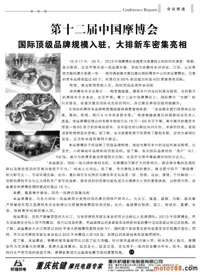 第三十三屆秋季全摩配也將于本月24-26日在南京國際會(huì)展中心召開,這是行業(yè)秋季大點(diǎn)兵。按照組委會(huì)的要求,大會(huì)的會(huì)刊將在本月15日抵達(dá)展館,所以也必須在國慶過后就得送去印刷。在今年秋季南京全摩會(huì),我們還將為參會(huì)企業(yè)和觀展的經(jīng)銷商,贈(zèng)送新版《華東市場指南》,由廣州工作站承制的《廣州市場導(dǎo)購指南》,今年第三期《摩托車與配件外貿(mào)報(bào)》,今年十月上、下期《摩托車與配件》雜志,以及部分庫存書——《中國摩托車配件生產(chǎn)企業(yè)大全》。《配件生產(chǎn)企業(yè)大全》上半年在濟(jì)南首發(fā),目前除湖南、湖北及山西、廣西、河北部分市場沒有發(fā)放外,其余市場基本都是送書上門;還有部分省級(jí)市場由雜志發(fā)行點(diǎn)代理發(fā)送;沒有收到這本書的以及不在摩配市場的企業(yè)請(qǐng)到我們南京展位C89領(lǐng)取;還有《華南、三北、西南》三個(gè)市場的指南,也在會(huì)上發(fā)送。因?yàn)閹齑娴臅欢啵枰@些書的企業(yè)請(qǐng)盡量早去我們展位領(lǐng)取,送完即止。