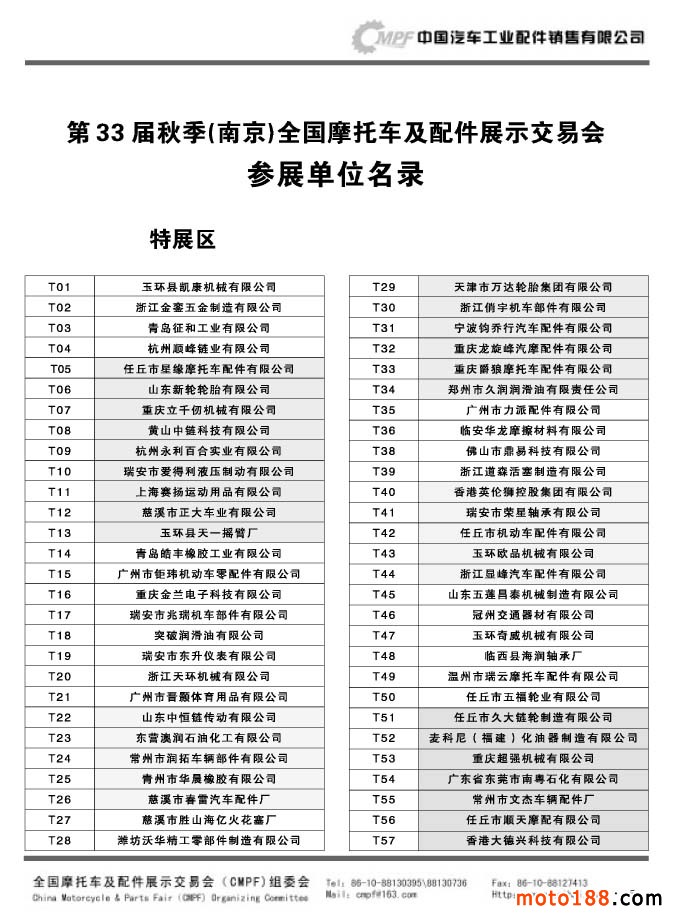 第33屆秋季(南京)全國摩托車及配件展示交易會參展單位名錄