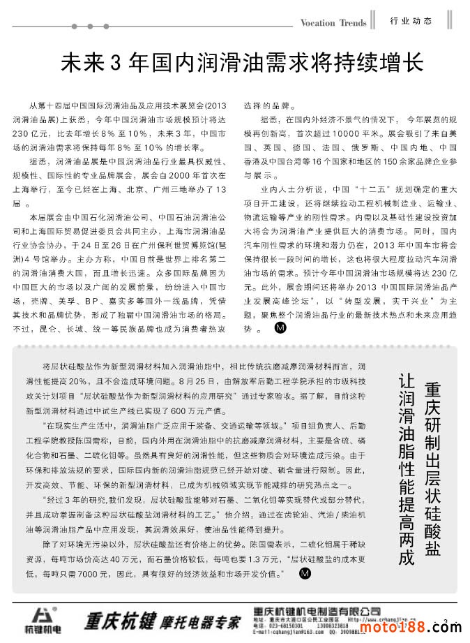 3 未來3年國內(nèi)潤滑油需求將持續(xù)增長/重慶研制出層狀硅酸鹽 讓潤滑油脂性能提高兩成