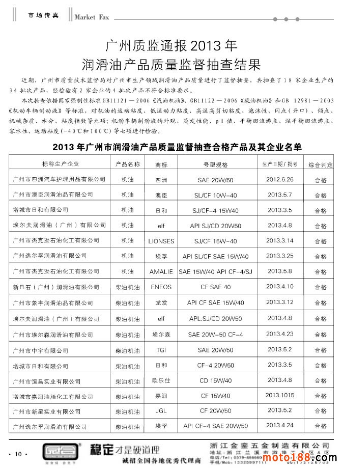 10 廣州質監通報2013年潤滑油產品質量監督抽查結果