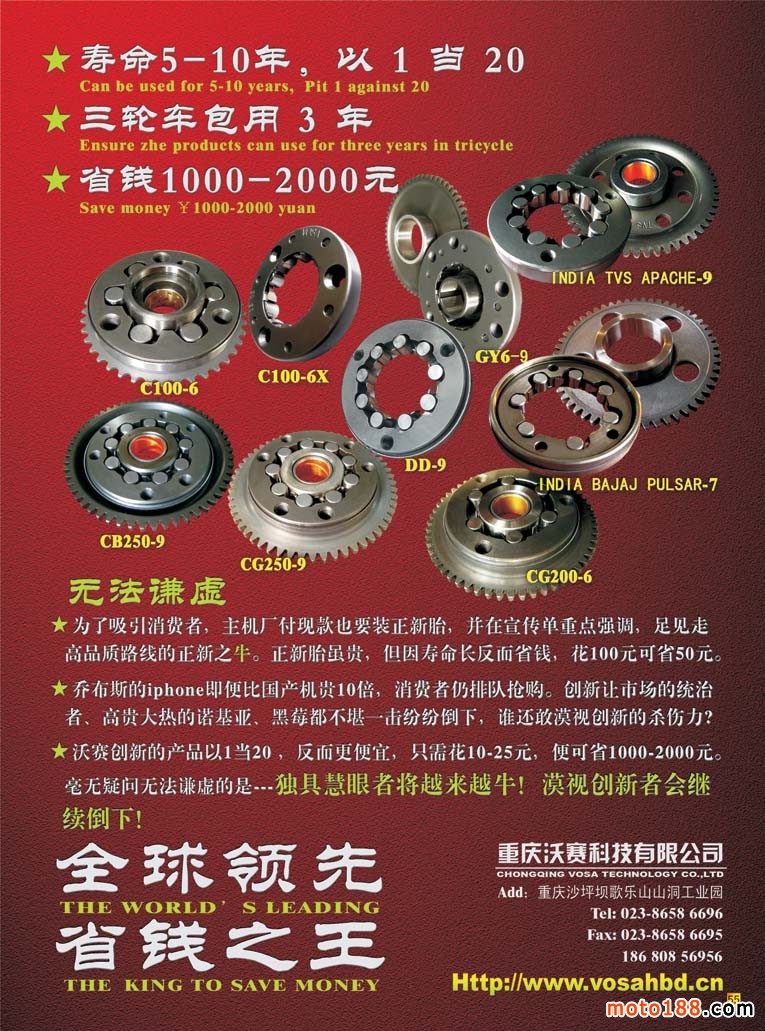隨著全摩會(huì)的閉幕,今年的配件行業(yè)經(jīng)營(yíng)也進(jìn)入到收宮階段,北方的天氣也漸漸轉(zhuǎn)冷,北方的市場(chǎng)也逐步趨淡。今年的市場(chǎng)銷售整體都不太好,無論是外貿(mào)還是內(nèi)銷市場(chǎng),我們雜志在今年也很努力,但是也能明顯地感覺到市場(chǎng)的寒意。盡管如此,我們?nèi)匀蝗〉昧溯^好的成績(jī):我們對(duì)華東市場(chǎng)進(jìn)行了精耕細(xì)作,走訪了市場(chǎng)的每一個(gè)客戶,搜集更新了市場(chǎng)的資料,并在南京秋摩會(huì)和重慶摩博會(huì)上將華東市場(chǎng)的第一手資料送給了企業(yè);同時(shí),在廣州市場(chǎng)也更新了最新的市場(chǎng)資料,并在秋摩會(huì)將這本資料送給了行業(yè)同仁。