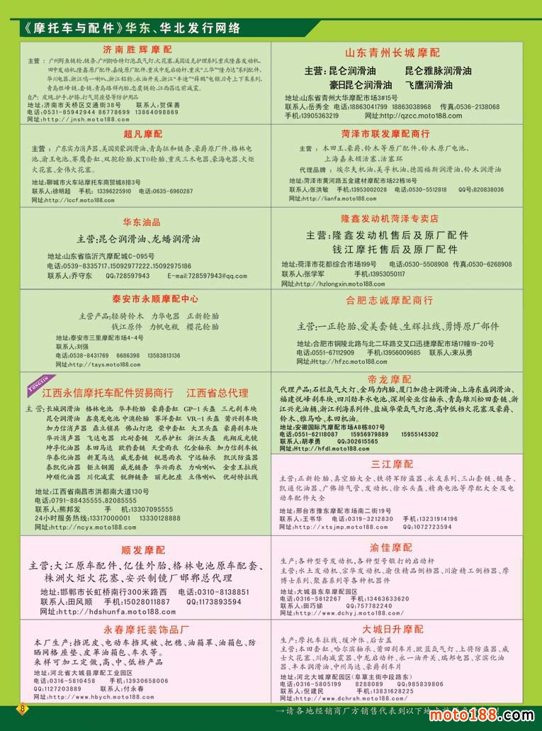 目前摩托車配件企業面臨比較嚴峻的市場現狀,但是我們了解到許多企業并不是坐以待毖,同時這個行業也在各個方面尋求突破,并且迎來了新的商機。我們雜志明年在信息發布上,也將增加和摩配行業有關的外延,如電動摩托車、三輪摩托車、助力車、小型通機等。這些零部件,都是我們配件廠能制造的,技術也是相通的。目前電動摩托、三輪摩托,小型通機市場都很不錯,產銷兩旺,有的還是有良好的發展遠景。除了通過紙媒來推廣和普及外,我們的網站也將同時增加這方面的動態信息,發布即時報道,開通這幾個板塊的專題,為行業傳輸更多的信息;我們的網站也將在今冬明春大改版,進一步擴容。在嚴峻的形勢下,我們一定要逆流而上,拓展生存和發展空間,同時我們也會將這幾方面的信息向行業傳遞,供行業企業決策參考。當然我們更要在市場的第一線增加發行,補充完善這幾方面的信息數據庫。這些工作先從各省會城市開始,由大市場向小市場拓展,充分利用現行發行網絡的功能,增加不同行業和市場的發行。