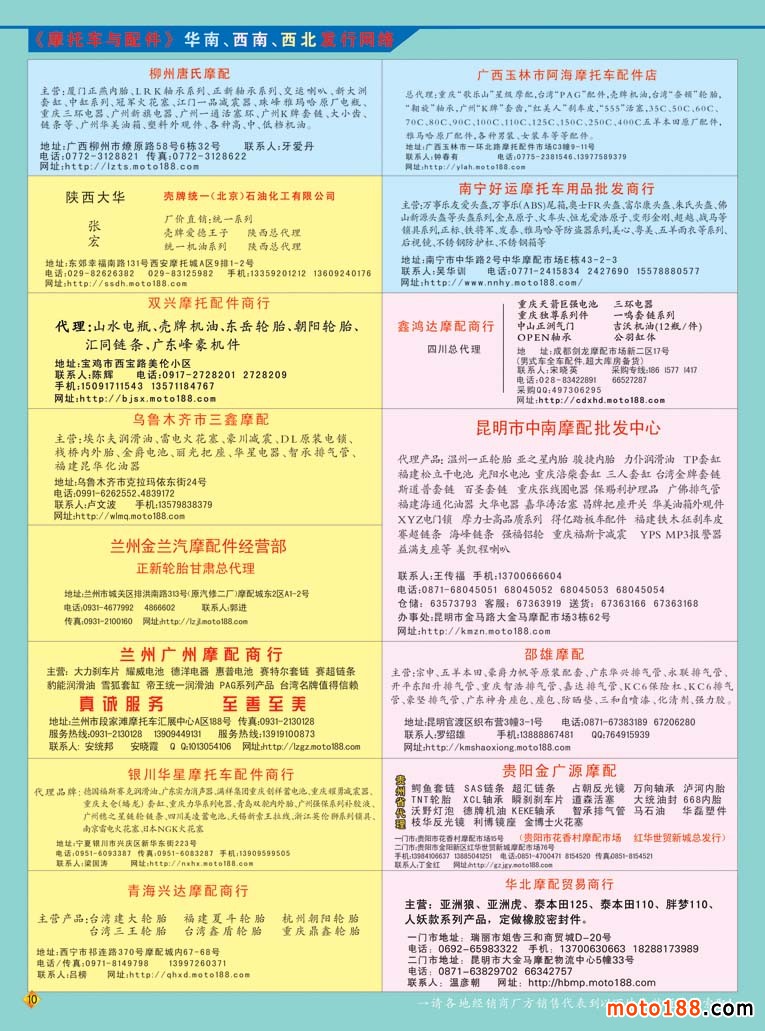 今年夏天,我們在完成華東市場的工作之外,結合2014年春季全摩會在西安召開的契機,我們基本完成對西北市場信息的采集。今年冬季我們將會對這些信息進行一一校核,在明年春天西安全摩會上,為行業奉上《西北市場指南》。這本書以西北自然行政區劃分,和前一個版本《西北》統規于《三北》不同。這三年,西北市場和東南市場發展完全不同,摩托車與配件在這些市場依然呈現上漲的勢頭,西北地區的市場面貌也不再是臟亂差,許多市場面貌也大為改觀,這本書在明春會奉獻給行業企業。《配件企業生產大全》繼濟南全摩會首發后,我們今年基本完成了在全國市場的派送,達到了預期的目標,計劃在明年下半年再次升級。