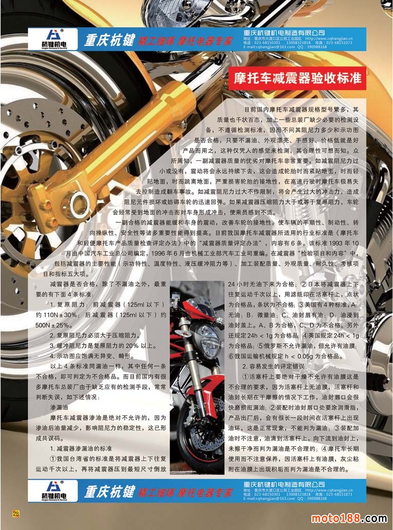 和這些歷經(jīng)風雨在摩配行業(yè)堅守的同仁們一樣,我們也煉得自信與從容。新的一年我們雜志以全新的面貌出現(xiàn),我們采用全彩色出刊,同時將我們的服務(wù)對象橫向延伸。與我們的同仁一樣,立足摩配,橫向拓展,內(nèi)外兼修,努力做好雜志,除了提升外觀品相,更是注重在內(nèi)容上的變化。每期雜志用十頁左右的文字來廣角掃描我們摩托車配件行業(yè)的子行業(yè),這一期推出的是減震器專題。上一期化油器專題出刊以后,不光受到市場的歡迎,有些企業(yè)還把我們的雜志認真地收藏保存好,因為有不少信息對于他們的生產(chǎn)、經(jīng)營都有一定幫助。對我們來說也是迫使我們更深入地了解摩配的各個子行業(yè)。自從前年摩托車行業(yè)開始強制提高排放標準以后,我們片面地認為化油器這個行業(yè)會被電噴完全取代,這個產(chǎn)業(yè)是不是已經(jīng)步入到夕陽期?通過編排我們較深刻的對這一產(chǎn)業(yè)有所了解,制造之地一派欣欣向榮的景象,在我們摩托車業(yè)需求量減少之時,我們的制造廠已經(jīng)在通機領(lǐng)域干得風生水起,有不少廠即使擴大產(chǎn)能也供不應(yīng)求。當?shù)氐胤秸矎倪@個產(chǎn)業(yè)得到許多實惠,一個雙贏的局面,這就是產(chǎn)業(yè)的正能量。其實市場如何變幻,總有一批做得好的龍頭企業(yè)在努力工作,打造自己的名牌,眼光不僅僅局限面前,更多地瞄準了國際市場。中國制造能漂洋過海,被國外消費者所接受,正是這樣一批行業(yè)精英為國家和民族在努力。
