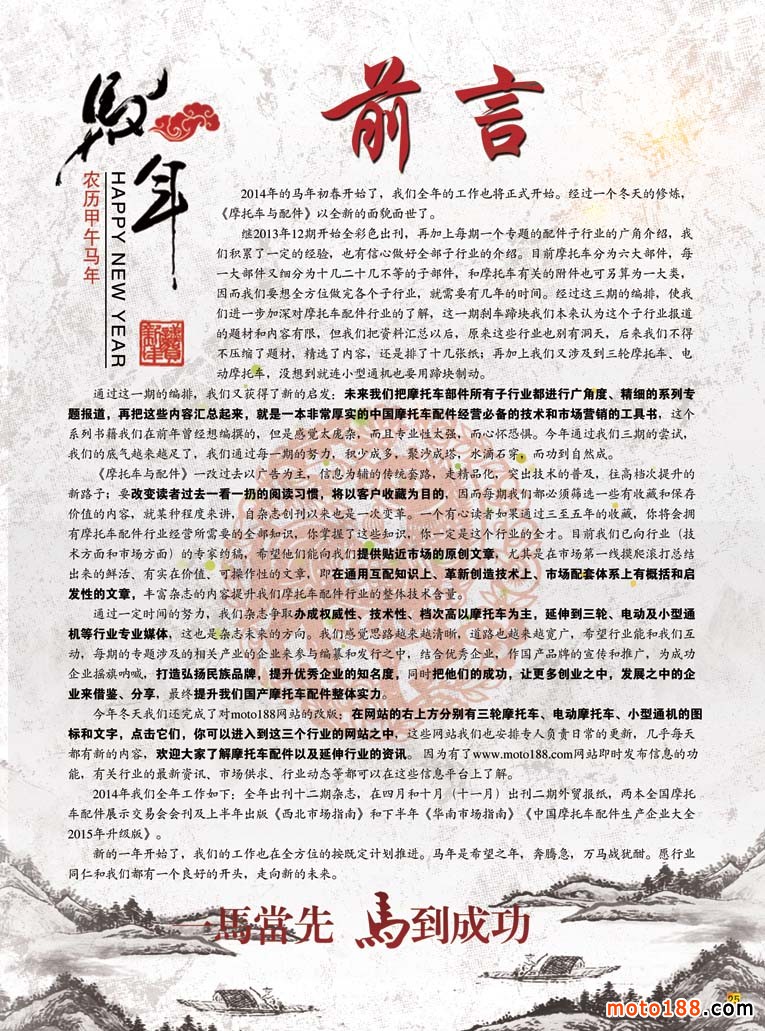 2014年的馬年初春開始了,我們?nèi)甑墓ぷ饕矊⒄介_始。經(jīng)過(guò)一個(gè)冬天的修煉,《摩托車與配件》以全新的面貌面世了。
