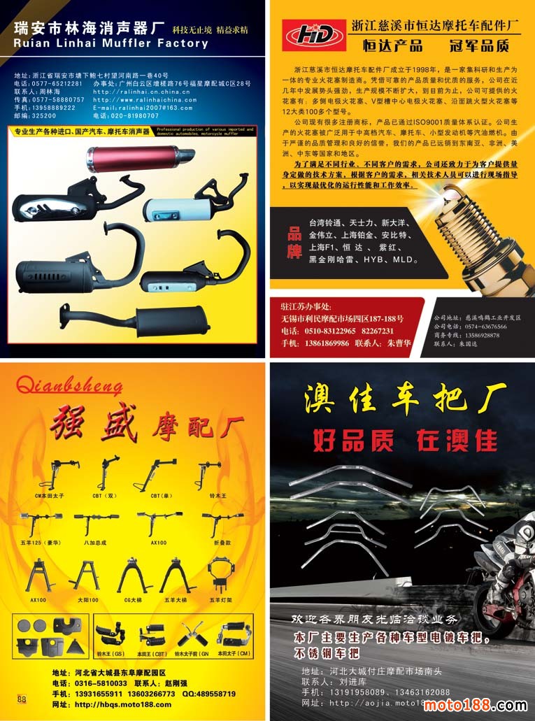 今年冬天我們還完成了對moto188網(wǎng)站的改版:在網(wǎng)站的右上方分別有三輪摩托車、電動摩托車、小型通機的圖標和文字,點擊它們,你可以進入到這三個行業(yè)的網(wǎng)站之中,這些網(wǎng)站我們也安排專人負責日常的更新,幾乎每天都有新的內(nèi)容,歡迎大家了解摩托車配件以及延伸行業(yè)的資訊。 因為有了