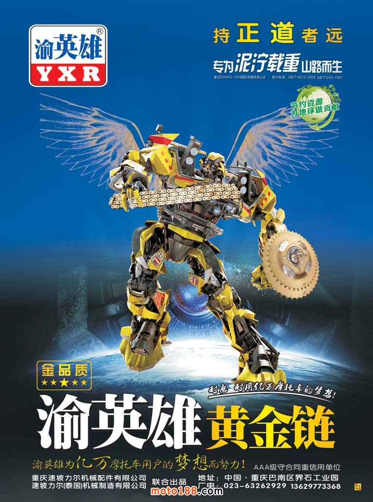 新的變革之后的《摩托車與配件》已經出了四個配件子產業的專題,通過這種形式的變革,我們對摩托車配件的微觀行業也有了越來越深入的了解。每一個子行業也都有做得不錯的龍頭企業,他們在這個子行業里通過橫向地拓展,觸角伸得也較廣泛。比如這一期是鏈條專題,其實不光摩托車用,電動車、汽車、工業機械....只要需要傳動的都有鏈條的身影。因而許多廠的產品也涉及了多行業,但是我們僅選擇與我們產業有關的產品做一般的技術報道;前沿行業作泛泛報道;市場運用方面則是盡可能以廣角報道。以前一些企業也在我們雜志上做過宣傳,因為我們認識水平淺,不容易突出重點品牌企業,因而在宣傳服務上也流于常規。但是通過這期專題后,我們了解到,像東華、恒久、順峰、雙獅、征和等都是這個行業的龍頭企業,而且這些龍頭企業后勁十足。他們不光在擴大產能生產;更是投入了相當的精力在搞科研;抑或引進國外的先進技術,不光在做大更是在做強,假以時日,他們也會在國際市場上占有一席之地。我們對這些企業充滿敬意,他們是民族工業的脊梁。雖然納稅沒有房地產企業多,也沒有金融和地產業的風光,但他們沒有固步自封,也不滿足現狀,帶著創新和發展的精神趕德超日超美,縮短與國際水平的差距,也正是因為有許多像這樣的實體產業,中國制造才能真正的做強。那些只制造虛的龐大GDP的、靠吸吮實體產業汁水而滋潤的和靠壟斷而光鮮的行業,在他們面前是多么的不堪。