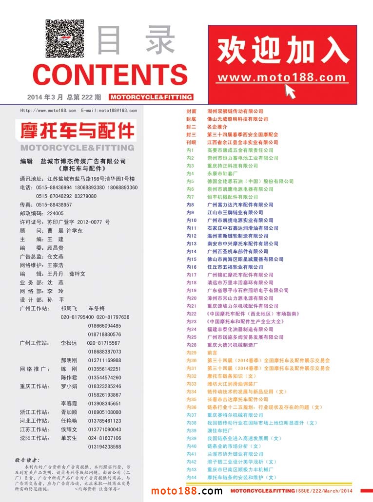 今年下半年我們將根據全摩會的地址變動而變動,下半年我們出版兩本書籍——《華南(廣東、海南)市場指南》、第十二次《中國摩托車配件生產業大全》升級版。廣州是中國摩托車配件的出口窗口,《華南版》廣州部分內容繼續用中英文雙語出版。