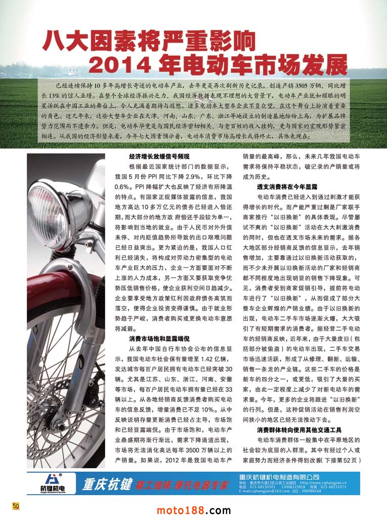 “沉舟側畔千帆過,病樹前頭萬木春”,半年的改版給我們帶來了良好的轉變,但我們不能固步自封,滿足現狀。會后我們就全行業形勢作了一個冷靜地思考,我們從五月份以后,對我們雜志再作一些微調:在做好摩配信息服務的同時,加大向電動車及新能源產業進軍的步伐;這次刊頭作了新的設計,突出了電動車產業,電動車涉及電動二輪、三輪、四輪;摩托車延伸向小型通機及三輪摩托車。每期我們在內容上區分各個主題,摩托車配件、電動車及配件、三輪和通機,版面比例為6422。這期我們精選了其它三個行業的信息,并用專題形式報道。今年六月中旬我們還將參加常州舉辦的電動車三輪車會議,八月上旬參加在鄭州舉辦的三輪車行業會議。在我們江、浙、滬長三角地區電動車產品既是主市場也是主產區,我們要充分利用這地域優勢做深做透。我們已經著手改版我們專業的電動車網站, www.moto189.com。通過一段時間的努力,將它做成m.zjsoxnet.com一樣的行業大型網站;同時我們先天的發行網絡優勢,可以通過這個網絡發行到各省會城市市場,因為這些市場基本上是電動車和摩托車配件混生的;在江浙滬地區,完成主要廠家的數據庫整理和完善并逐步發行到位。我想,通過一年的努力,我們在這些行業也會成為有影響力的媒體,我們有信心做好這項工作。在目前低迷的市場狀況下,我們增加了開拓市場的人員,將這些工作做實做透;同時為了我們的雜志能發行到這些新行業企業的手中,我們已經增加了三分之一的印量。以后版本的《市場指南》我們也會將電動車企業一并收錄進來,明年的春天就可以見證至我們的努力成果。