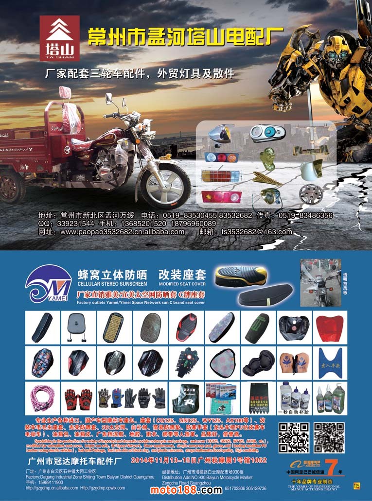 我們雜志在五月份對版面進行了微調,摩托車、電動車、通機等按一定的比例選材編排《摩托車與配件》的外延已經展開,涉及到我們配件行業的相關企業。通過我們對中南地區及華東市場的走訪,我們更加感覺我們調整的及時,緊貼市場。目前摩托車行業在華東地區變化非常大,有昨日黃花之感覺,一些我們以前了解的大戶,曾經門庭若市,現在卻門庭冷落車馬稀,有的不堪門面費用,已轉到倉儲用大篷車送貨銷售。相比而言,中南地區市場變化不算大,在經營數量上還略有增加。摩托車整車市場變化超過了我們配件市場,除了摩托車整車十大品牌還依然屹立,一些小品牌在市場已經很少能看見。這些撤走的小品牌車的門店,變成了電動車和三輪車的門面了,有的甚至是電動四輪車。一些企業稱這些車是新能源汽車,能源肯定是新的,但是作為汽車也稍微寒磣了一點吧。盡管如此,有的地區已經呈現出將要成市的勢頭,但愿這類車在二三線城市不要遭受摩托車的命運。