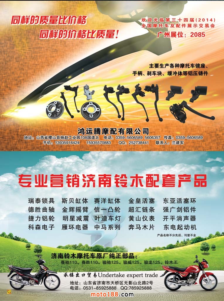 我們雜志在五月份對版面進行了微調,摩托車、電動車、通機等按一定的比例選材編排《摩托車與配件》的外延已經展開,涉及到我們配件行業的相關企業。通過我們對中南地區及華東市場的走訪,我們更加感覺我們調整的及時,緊貼市場。目前摩托車行業在華東地區變化非常大,有昨日黃花之感覺,一些我們以前了解的大戶,曾經門庭若市,現在卻門庭冷落車馬稀,有的不堪門面費用,已轉到倉儲用大篷車送貨銷售。相比而言,中南地區市場變化不算大,在經營數量上還略有增加。摩托車整車市場變化超過了我們配件市場,除了摩托車整車十大品牌還依然屹立,一些小品牌在市場已經很少能看見。這些撤走的小品牌車的門店,變成了電動車和三輪車的門面了,有的甚至是電動四輪車。一些企業稱這些車是新能源汽車,能源肯定是新的,但是作為汽車也稍微寒磣了一點吧。盡管如此,有的地區已經呈現出將要成市的勢頭,但愿這類車在二三線城市不要遭受摩托車的命運。