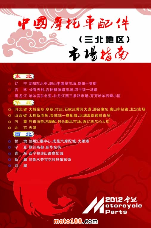 下版為《中國(guó)摩托車配件·西南市場(chǎng)指南》,包括重慶、云南、貴州、四川及陜西省四省一市地區(qū),收錄二千二百多家配件銷售企業(yè)匯總成書(shū),本書(shū)所有資料將是我刊在2011年冬及2012年春收集匯總更新整理的最新最準(zhǔn)確的市場(chǎng)第一手資料。