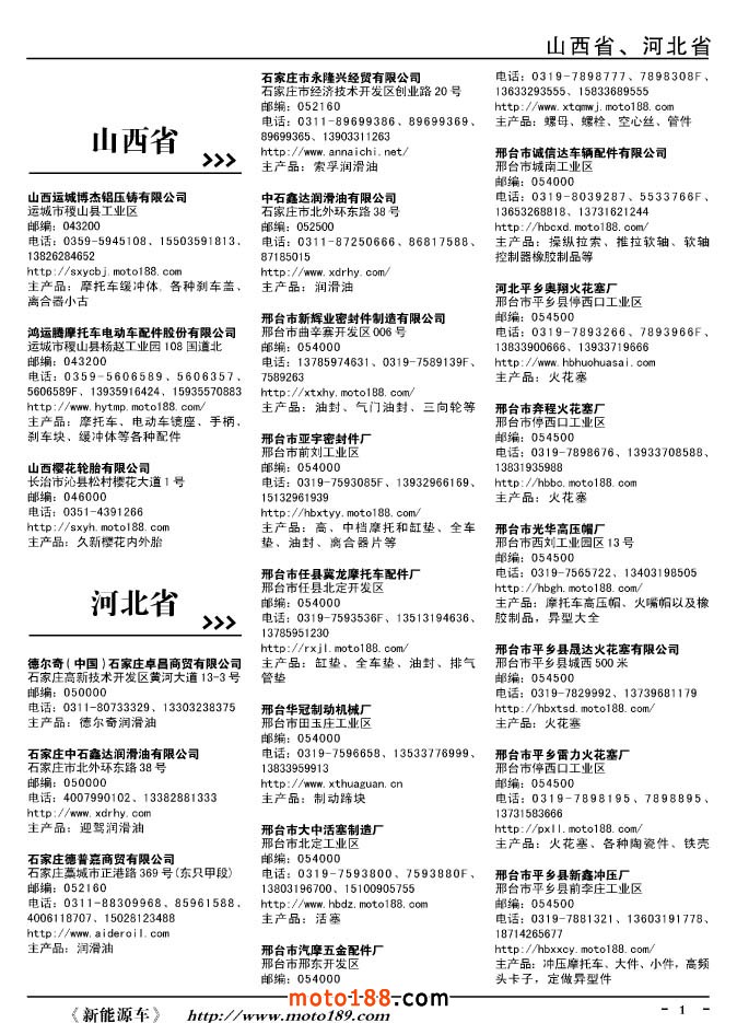 這兩年行業(yè)調(diào)整力度非常大,為了確保我們提供的信息準(zhǔn)確性,我們本著寧缺毋濫的原則,不去圖虛的數(shù)量。目前摩托車與配件行業(yè)的不少經(jīng)銷商是跨行業(yè)經(jīng)營(yíng)的,所以我們?cè)诒緯性黾恿瞬糠帜ν熊囌噺S、電動(dòng)車生產(chǎn)廠、機(jī)動(dòng)三輪車制造廠。所選的這些企業(yè)都是這個(gè)行業(yè)具有影響力的品牌企業(yè),是為了大家在使用這本書時(shí),獲取相關(guān)的延伸產(chǎn)業(yè)更多的實(shí)用信息。