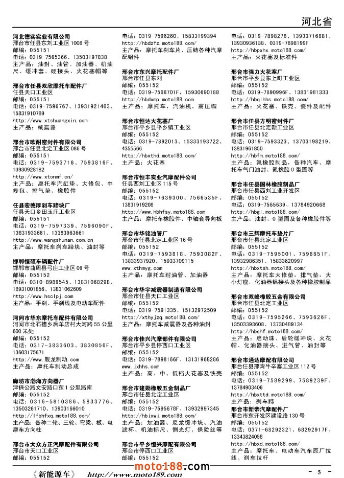 這兩年行業調整力度非常大,為了確保我們提供的信息準確性,我們本著寧缺毋濫的原則,不去圖虛的數量。目前摩托車與配件行業的不少經銷商是跨行業經營的,所以我們在本書中增加了部分摩托車整車廠、電動車生產廠、機動三輪車制造廠。所選的這些企業都是這個行業具有影響力的品牌企業,是為了大家在使用這本書時,獲取相關的延伸產業更多的實用信息。