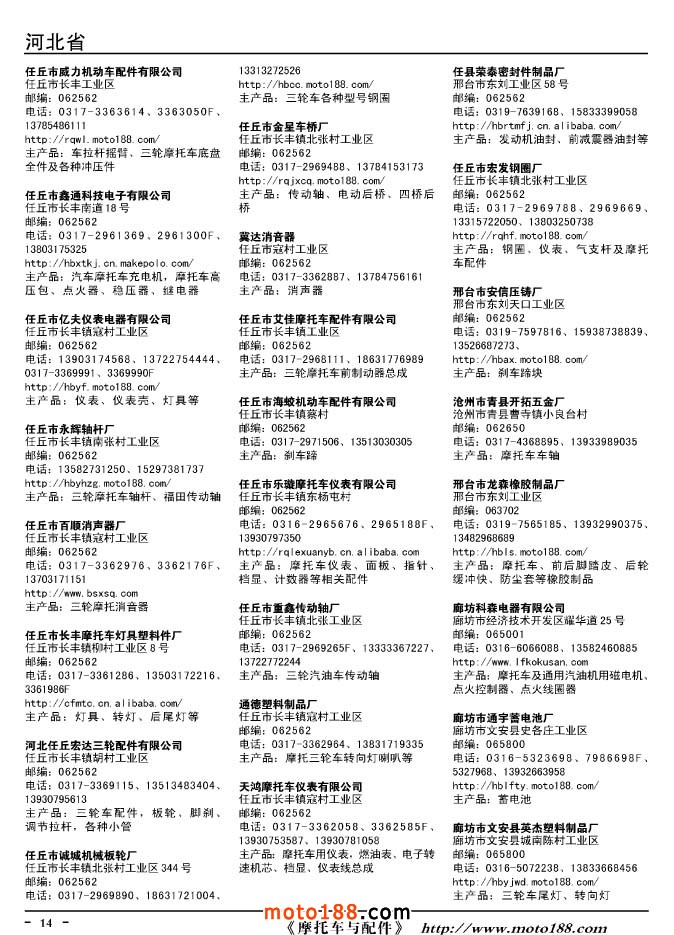 這兩年行業調整力度非常大,為了確保我們提供的信息準確性,我們本著寧缺毋濫的原則,不去圖虛的數量。目前摩托車與配件行業的不少經銷商是跨行業經營的,所以我們在本書中增加了部分摩托車整車廠、電動車生產廠、機動三輪車制造廠。所選的這些企業都是這個行業具有影響力的品牌企業,是為了大家在使用這本書時,獲取相關的延伸產業更多的實用信息。