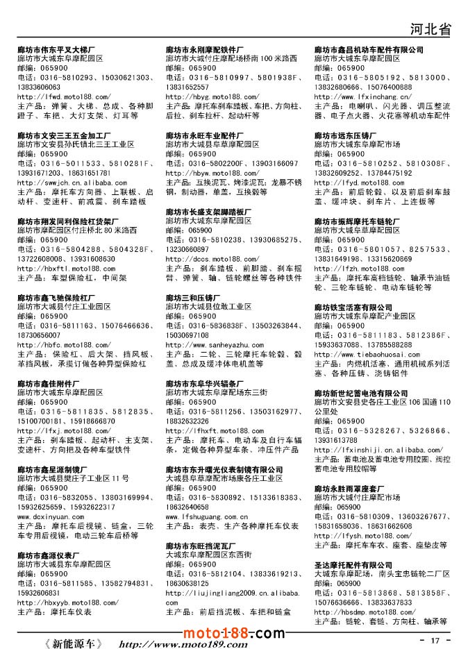 這兩年行業調整力度非常大,為了確保我們提供的信息準確性,我們本著寧缺毋濫的原則,不去圖虛的數量。目前摩托車與配件行業的不少經銷商是跨行業經營的,所以我們在本書中增加了部分摩托車整車廠、電動車生產廠、機動三輪車制造廠。所選的這些企業都是這個行業具有影響力的品牌企業,是為了大家在使用這本書時,獲取相關的延伸產業更多的實用信息。