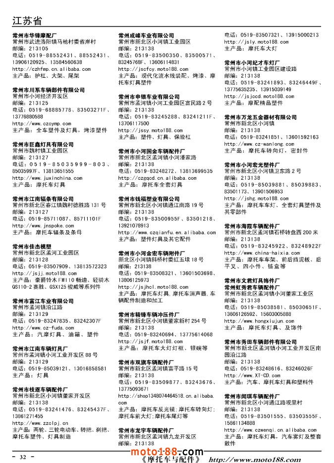 這兩年行業調整力度非常大,為了確保我們提供的信息準確性,我們本著寧缺毋濫的原則,不去圖虛的數量。目前摩托車與配件行業的不少經銷商是跨行業經營的,所以我們在本書中增加了部分摩托車整車廠、電動車生產廠、機動三輪車制造廠。所選的這些企業都是這個行業具有影響力的品牌企業,是為了大家在使用這本書時,獲取相關的延伸產業更多的實用信息。