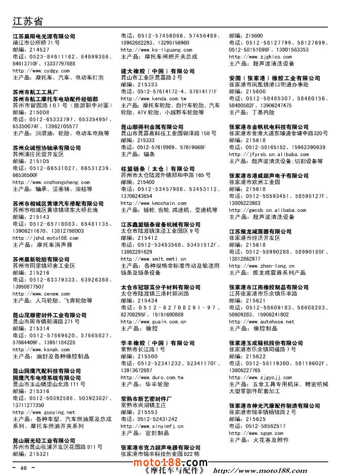 這兩年行業調整力度非常大,為了確保我們提供的信息準確性,我們本著寧缺毋濫的原則,不去圖虛的數量。目前摩托車與配件行業的不少經銷商是跨行業經營的,所以我們在本書中增加了部分摩托車整車廠、電動車生產廠、機動三輪車制造廠。所選的這些企業都是這個行業具有影響力的品牌企業,是為了大家在使用這本書時,獲取相關的延伸產業更多的實用信息。