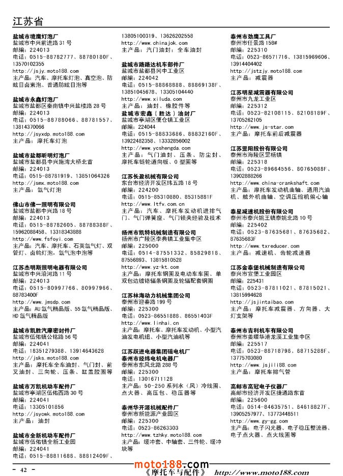 這兩年行業(yè)調(diào)整力度非常大,為了確保我們提供的信息準(zhǔn)確性,我們本著寧缺毋濫的原則,不去圖虛的數(shù)量。目前摩托車與配件行業(yè)的不少經(jīng)銷商是跨行業(yè)經(jīng)營的,所以我們在本書中增加了部分摩托車整車廠、電動車生產(chǎn)廠、機動三輪車制造廠。所選的這些企業(yè)都是這個行業(yè)具有影響力的品牌企業(yè),是為了大家在使用這本書時,獲取相關(guān)的延伸產(chǎn)業(yè)更多的實用信息。