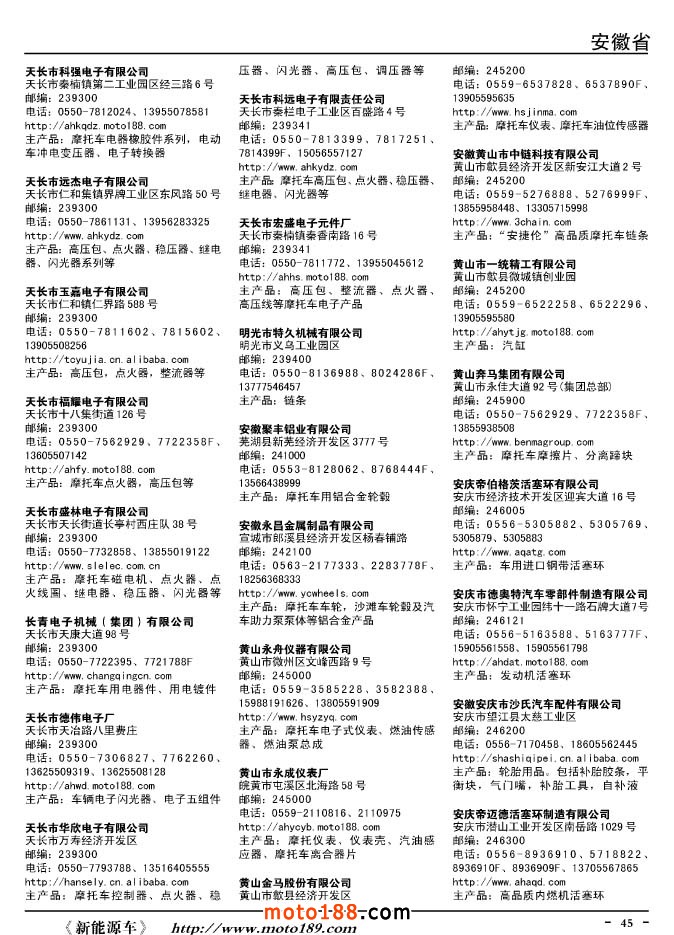 這兩年行業調整力度非常大,為了確保我們提供的信息準確性,我們本著寧缺毋濫的原則,不去圖虛的數量。目前摩托車與配件行業的不少經銷商是跨行業經營的,所以我們在本書中增加了部分摩托車整車廠、電動車生產廠、機動三輪車制造廠。所選的這些企業都是這個行業具有影響力的品牌企業,是為了大家在使用這本書時,獲取相關的延伸產業更多的實用信息。
