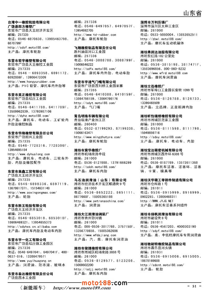 這兩年行業調整力度非常大,為了確保我們提供的信息準確性,我們本著寧缺毋濫的原則,不去圖虛的數量。目前摩托車與配件行業的不少經銷商是跨行業經營的,所以我們在本書中增加了部分摩托車整車廠、電動車生產廠、機動三輪車制造廠。所選的這些企業都是這個行業具有影響力的品牌企業,是為了大家在使用這本書時,獲取相關的延伸產業更多的實用信息。