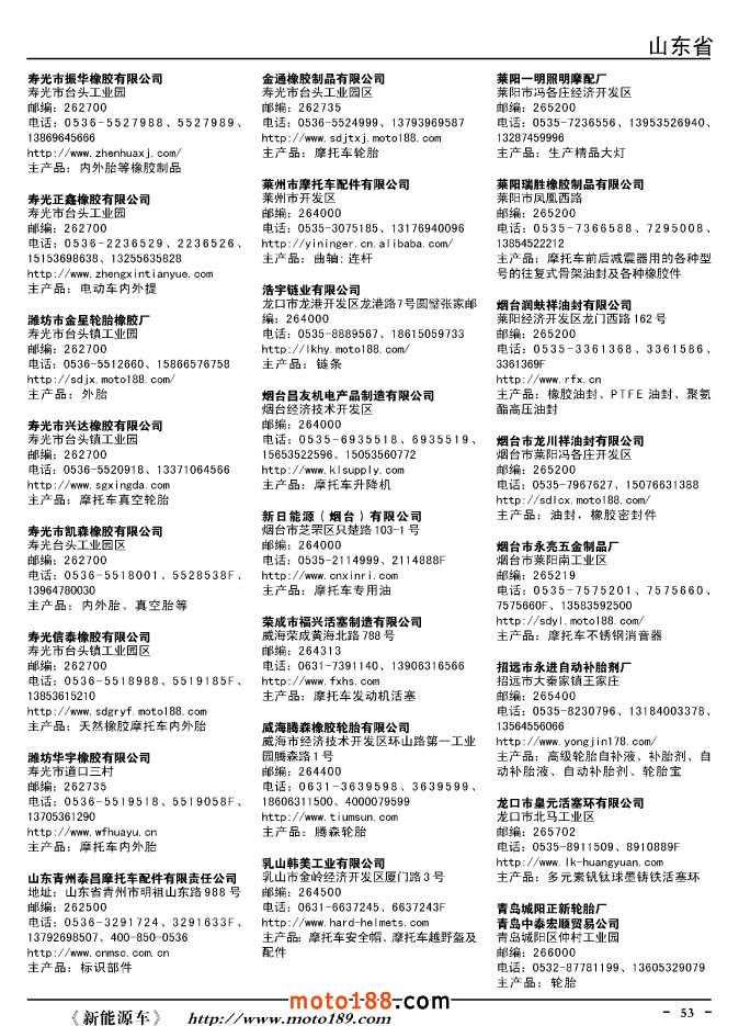 這兩年行業調整力度非常大,為了確保我們提供的信息準確性,我們本著寧缺毋濫的原則,不去圖虛的數量。目前摩托車與配件行業的不少經銷商是跨行業經營的,所以我們在本書中增加了部分摩托車整車廠、電動車生產廠、機動三輪車制造廠。所選的這些企業都是這個行業具有影響力的品牌企業,是為了大家在使用這本書時,獲取相關的延伸產業更多的實用信息。