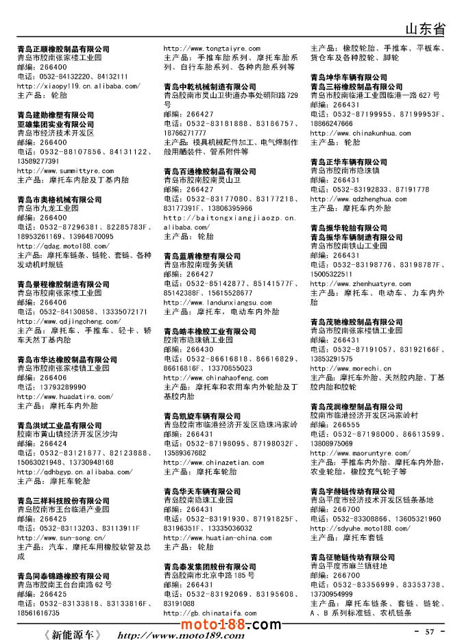 這兩年行業調整力度非常大,為了確保我們提供的信息準確性,我們本著寧缺毋濫的原則,不去圖虛的數量。目前摩托車與配件行業的不少經銷商是跨行業經營的,所以我們在本書中增加了部分摩托車整車廠、電動車生產廠、機動三輪車制造廠。所選的這些企業都是這個行業具有影響力的品牌企業,是為了大家在使用這本書時,獲取相關的延伸產業更多的實用信息。