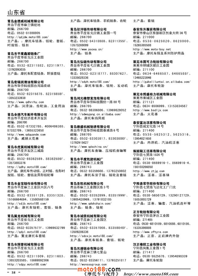 這兩年行業(yè)調(diào)整力度非常大,為了確保我們提供的信息準(zhǔn)確性,我們本著寧缺毋濫的原則,不去圖虛的數(shù)量。目前摩托車(chē)與配件行業(yè)的不少經(jīng)銷(xiāo)商是跨行業(yè)經(jīng)營(yíng)的,所以我們?cè)诒緯?shū)中增加了部分摩托車(chē)整車(chē)廠、電動(dòng)車(chē)生產(chǎn)廠、機(jī)動(dòng)三輪車(chē)制造廠。所選的這些企業(yè)都是這個(gè)行業(yè)具有影響力的品牌企業(yè),是為了大家在使用這本書(shū)時(shí),獲取相關(guān)的延伸產(chǎn)業(yè)更多的實(shí)用信息。