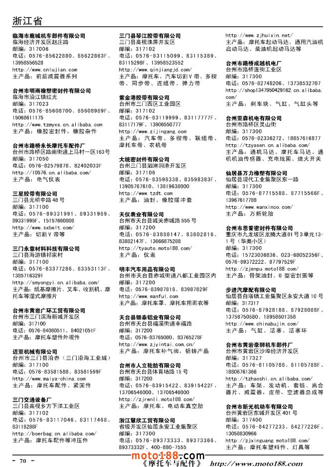 這兩年行業調整力度非常大,為了確保我們提供的信息準確性,我們本著寧缺毋濫的原則,不去圖虛的數量。目前摩托車與配件行業的不少經銷商是跨行業經營的,所以我們在本書中增加了部分摩托車整車廠、電動車生產廠、機動三輪車制造廠。所選的這些企業都是這個行業具有影響力的品牌企業,是為了大家在使用這本書時,獲取相關的延伸產業更多的實用信息。