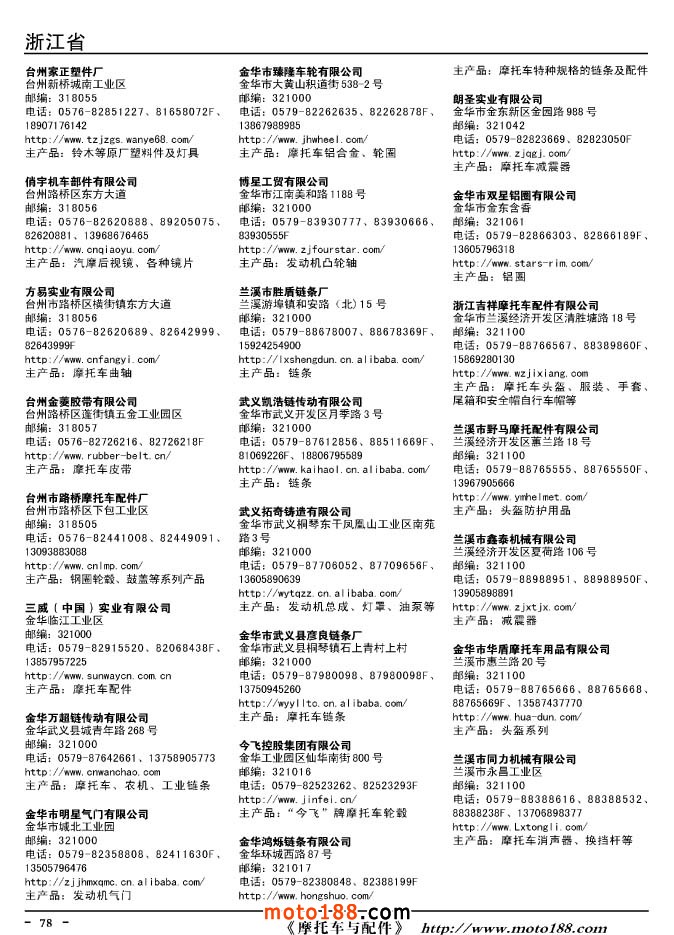 這兩年行業(yè)調(diào)整力度非常大,為了確保我們提供的信息準(zhǔn)確性,我們本著寧缺毋濫的原則,不去圖虛的數(shù)量。目前摩托車與配件行業(yè)的不少經(jīng)銷商是跨行業(yè)經(jīng)營的,所以我們在本書中增加了部分摩托車整車廠、電動車生產(chǎn)廠、機動三輪車制造廠。所選的這些企業(yè)都是這個行業(yè)具有影響力的品牌企業(yè),是為了大家在使用這本書時,獲取相關(guān)的延伸產(chǎn)業(yè)更多的實用信息。