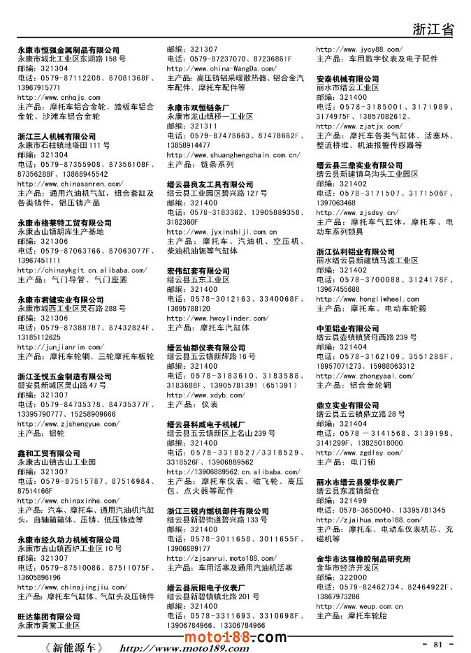 這兩年行業調整力度非常大,為了確保我們提供的信息準確性,我們本著寧缺毋濫的原則,不去圖虛的數量。目前摩托車與配件行業的不少經銷商是跨行業經營的,所以我們在本書中增加了部分摩托車整車廠、電動車生產廠、機動三輪車制造廠。所選的這些企業都是這個行業具有影響力的品牌企業,是為了大家在使用這本書時,獲取相關的延伸產業更多的實用信息。