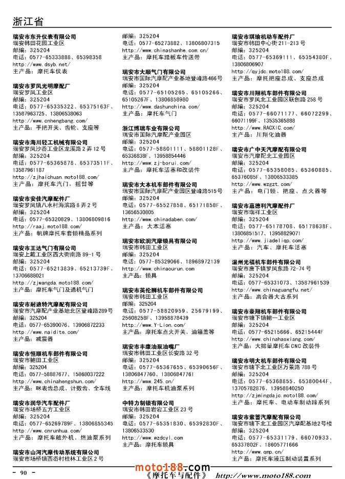 這兩年行業調整力度非常大,為了確保我們提供的信息準確性,我們本著寧缺毋濫的原則,不去圖虛的數量。目前摩托車與配件行業的不少經銷商是跨行業經營的,所以我們在本書中增加了部分摩托車整車廠、電動車生產廠、機動三輪車制造廠。所選的這些企業都是這個行業具有影響力的品牌企業,是為了大家在使用這本書時,獲取相關的延伸產業更多的實用信息。