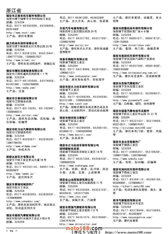 這兩年行業調整力度非常大,為了確保我們提供的信息準確性,我們本著寧缺毋濫的原則,不去圖虛的數量。目前摩托車與配件行業的不少經銷商是跨行業經營的,所以我們在本書中增加了部分摩托車整車廠、電動車生產廠、機動三輪車制造廠。所選的這些企業都是這個行業具有影響力的品牌企業,是為了大家在使用這本書時,獲取相關的延伸產業更多的實用信息。
