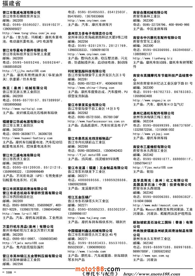 這兩年行業(yè)調(diào)整力度非常大,為了確保我們提供的信息準(zhǔn)確性,我們本著寧缺毋濫的原則,不去圖虛的數(shù)量。目前摩托車與配件行業(yè)的不少經(jīng)銷商是跨行業(yè)經(jīng)營的,所以我們在本書中增加了部分摩托車整車廠、電動車生產(chǎn)廠、機(jī)動三輪車制造廠。所選的這些企業(yè)都是這個行業(yè)具有影響力的品牌企業(yè),是為了大家在使用這本書時,獲取相關(guān)的延伸產(chǎn)業(yè)更多的實用信息。