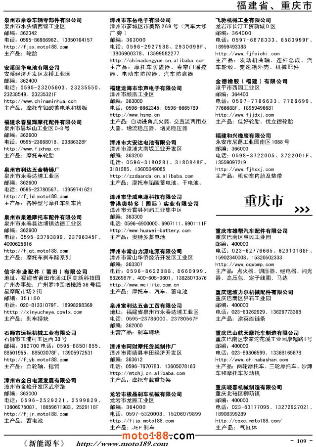 這兩年行業調整力度非常大,為了確保我們提供的信息準確性,我們本著寧缺毋濫的原則,不去圖虛的數量。目前摩托車與配件行業的不少經銷商是跨行業經營的,所以我們在本書中增加了部分摩托車整車廠、電動車生產廠、機動三輪車制造廠。所選的這些企業都是這個行業具有影響力的品牌企業,是為了大家在使用這本書時,獲取相關的延伸產業更多的實用信息。