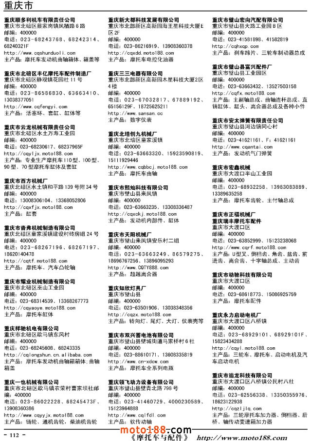 這兩年行業調整力度非常大,為了確保我們提供的信息準確性,我們本著寧缺毋濫的原則,不去圖虛的數量。目前摩托車與配件行業的不少經銷商是跨行業經營的,所以我們在本書中增加了部分摩托車整車廠、電動車生產廠、機動三輪車制造廠。所選的這些企業都是這個行業具有影響力的品牌企業,是為了大家在使用這本書時,獲取相關的延伸產業更多的實用信息。