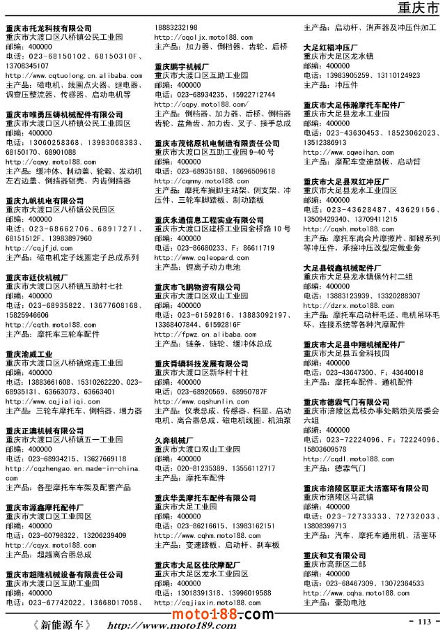 這兩年行業調整力度非常大,為了確保我們提供的信息準確性,我們本著寧缺毋濫的原則,不去圖虛的數量。目前摩托車與配件行業的不少經銷商是跨行業經營的,所以我們在本書中增加了部分摩托車整車廠、電動車生產廠、機動三輪車制造廠。所選的這些企業都是這個行業具有影響力的品牌企業,是為了大家在使用這本書時,獲取相關的延伸產業更多的實用信息。