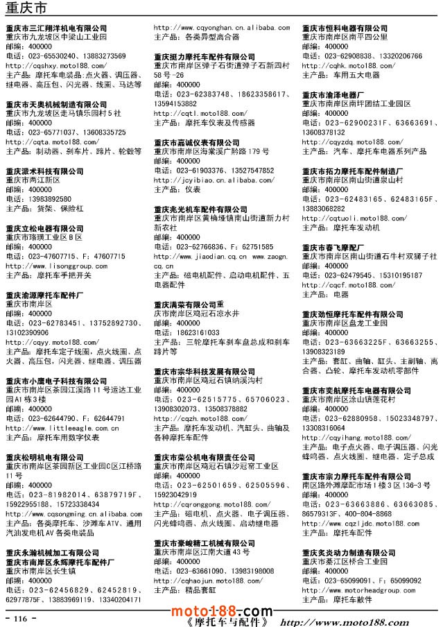 這兩年行業調整力度非常大,為了確保我們提供的信息準確性,我們本著寧缺毋濫的原則,不去圖虛的數量。目前摩托車與配件行業的不少經銷商是跨行業經營的,所以我們在本書中增加了部分摩托車整車廠、電動車生產廠、機動三輪車制造廠。所選的這些企業都是這個行業具有影響力的品牌企業,是為了大家在使用這本書時,獲取相關的延伸產業更多的實用信息。