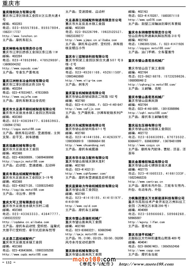 這兩年行業(yè)調(diào)整力度非常大,為了確保我們提供的信息準(zhǔn)確性,我們本著寧缺毋濫的原則,不去圖虛的數(shù)量。目前摩托車與配件行業(yè)的不少經(jīng)銷商是跨行業(yè)經(jīng)營(yíng)的,所以我們?cè)诒緯性黾恿瞬糠帜ν熊囌噺S、電動(dòng)車生產(chǎn)廠、機(jī)動(dòng)三輪車制造廠。所選的這些企業(yè)都是這個(gè)行業(yè)具有影響力的品牌企業(yè),是為了大家在使用這本書時(shí),獲取相關(guān)的延伸產(chǎn)業(yè)更多的實(shí)用信息。