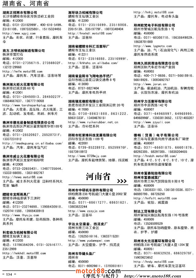 這兩年行業調整力度非常大,為了確保我們提供的信息準確性,我們本著寧缺毋濫的原則,不去圖虛的數量。目前摩托車與配件行業的不少經銷商是跨行業經營的,所以我們在本書中增加了部分摩托車整車廠、電動車生產廠、機動三輪車制造廠。所選的這些企業都是這個行業具有影響力的品牌企業,是為了大家在使用這本書時,獲取相關的延伸產業更多的實用信息。