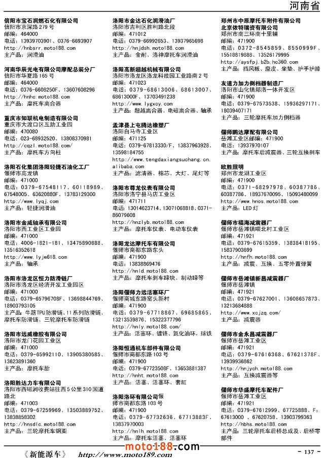 這兩年行業調整力度非常大,為了確保我們提供的信息準確性,我們本著寧缺毋濫的原則,不去圖虛的數量。目前摩托車與配件行業的不少經銷商是跨行業經營的,所以我們在本書中增加了部分摩托車整車廠、電動車生產廠、機動三輪車制造廠。所選的這些企業都是這個行業具有影響力的品牌企業,是為了大家在使用這本書時,獲取相關的延伸產業更多的實用信息。