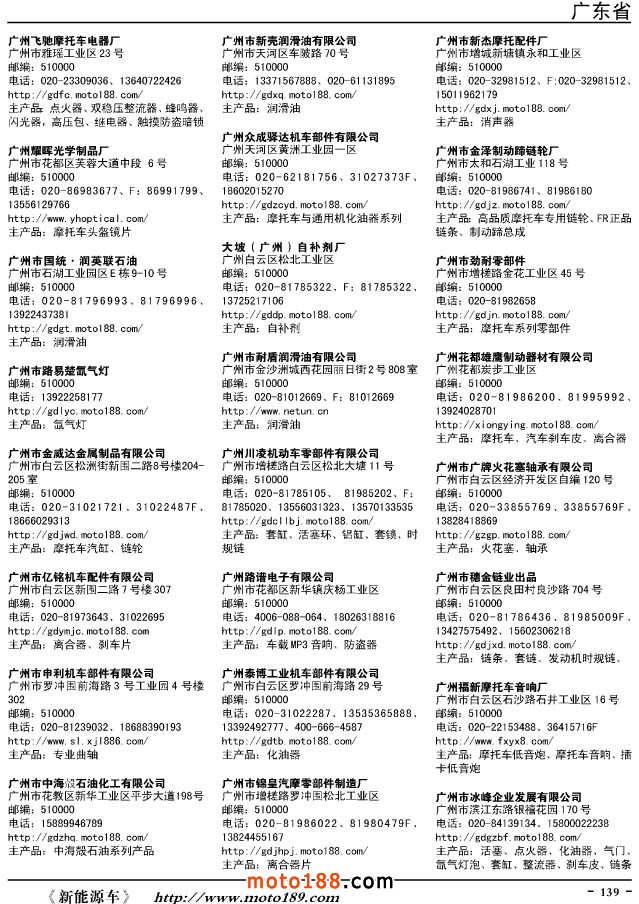 這兩年行業調整力度非常大,為了確保我們提供的信息準確性,我們本著寧缺毋濫的原則,不去圖虛的數量。目前摩托車與配件行業的不少經銷商是跨行業經營的,所以我們在本書中增加了部分摩托車整車廠、電動車生產廠、機動三輪車制造廠。所選的這些企業都是這個行業具有影響力的品牌企業,是為了大家在使用這本書時,獲取相關的延伸產業更多的實用信息。