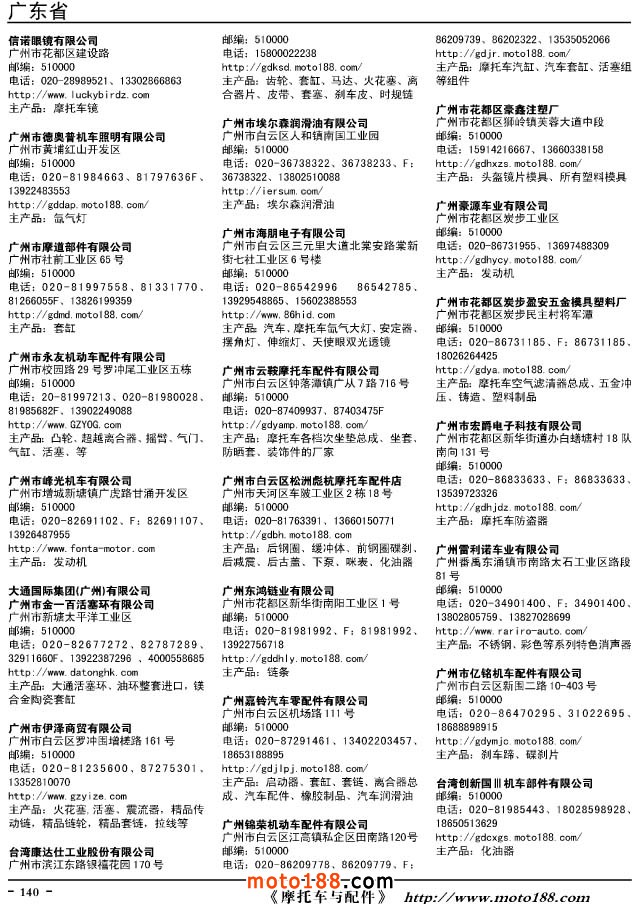 這兩年行業(yè)調(diào)整力度非常大,為了確保我們提供的信息準(zhǔn)確性,我們本著寧缺毋濫的原則,不去圖虛的數(shù)量。目前摩托車與配件行業(yè)的不少經(jīng)銷商是跨行業(yè)經(jīng)營的,所以我們在本書中增加了部分摩托車整車廠、電動車生產(chǎn)廠、機動三輪車制造廠。所選的這些企業(yè)都是這個行業(yè)具有影響力的品牌企業(yè),是為了大家在使用這本書時,獲取相關(guān)的延伸產(chǎn)業(yè)更多的實用信息。