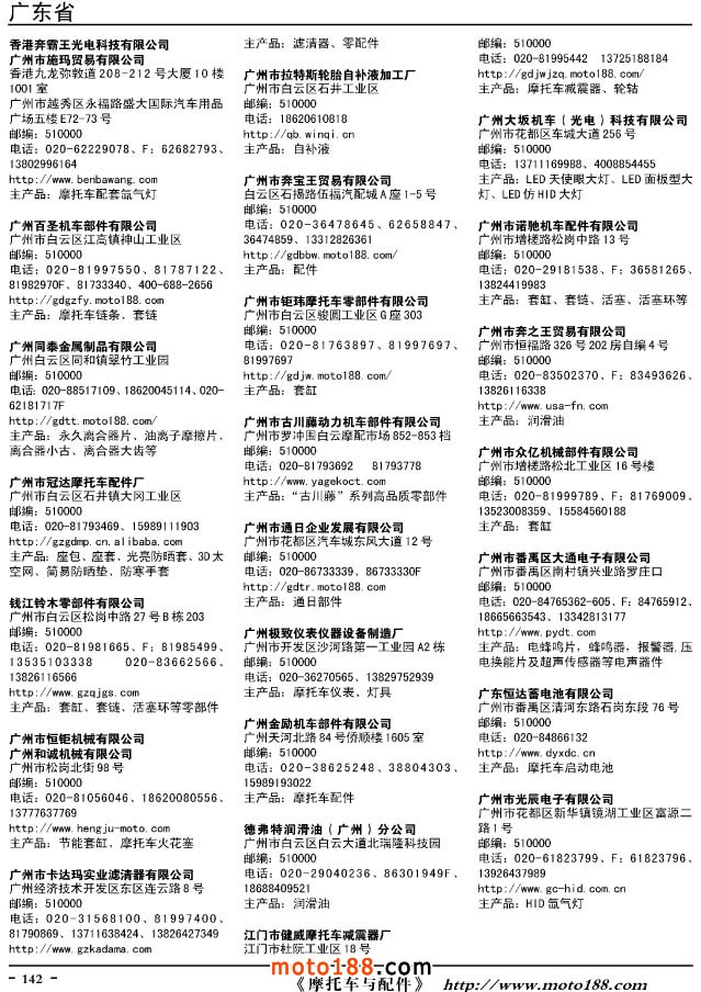 這兩年行業調整力度非常大,為了確保我們提供的信息準確性,我們本著寧缺毋濫的原則,不去圖虛的數量。目前摩托車與配件行業的不少經銷商是跨行業經營的,所以我們在本書中增加了部分摩托車整車廠、電動車生產廠、機動三輪車制造廠。所選的這些企業都是這個行業具有影響力的品牌企業,是為了大家在使用這本書時,獲取相關的延伸產業更多的實用信息。